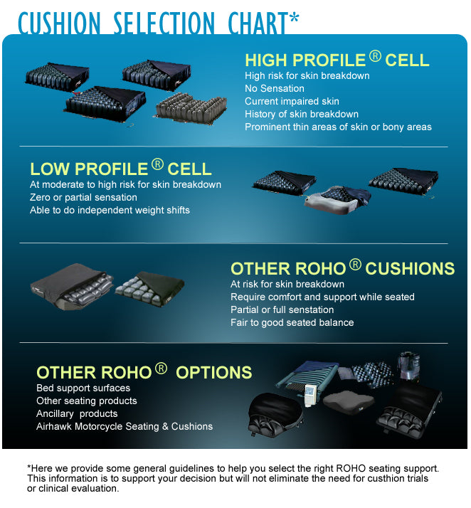 - ROHO cushions utilize air cell technology to provide adjustable pressure relief and support.